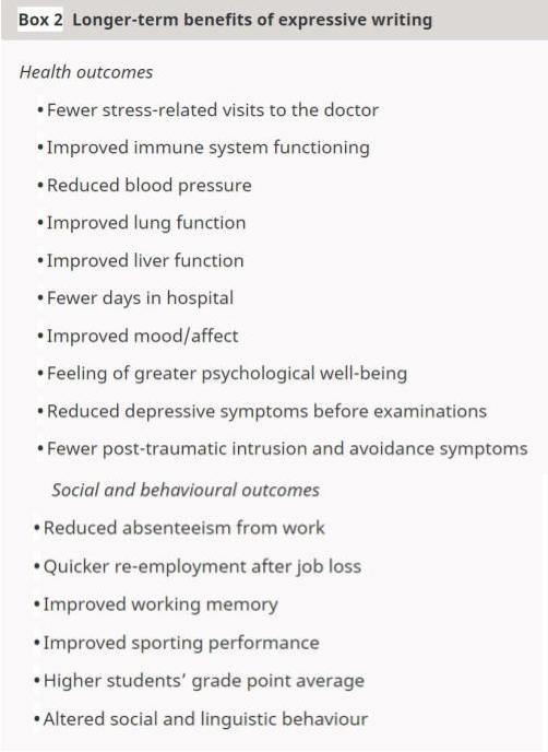 What was the outcome of this study? The authors of this journal article, Karen A. Baikie and Kay Wilhelm, found the “immediate impact of expressive writing is usually a short-term increase in distress, negative mood and physical symptoms, and a decrease in positive mood compared with controls. However, at longer-term follow-up, many studies have continued to find evidence of health benefits in terms of objectively assessed outcomes, self-reported physical health outcomes and self-reported emotional health outcomes.”