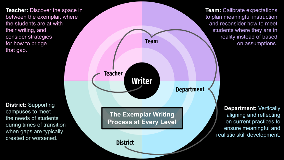 As teacher, department, and district instructional or administrative leaders, we can write exemplars of assignments through the eyes of the student to re-evaluate our expectations and have concrete conversations about how to adjust our expectations to meet our writers where they are.