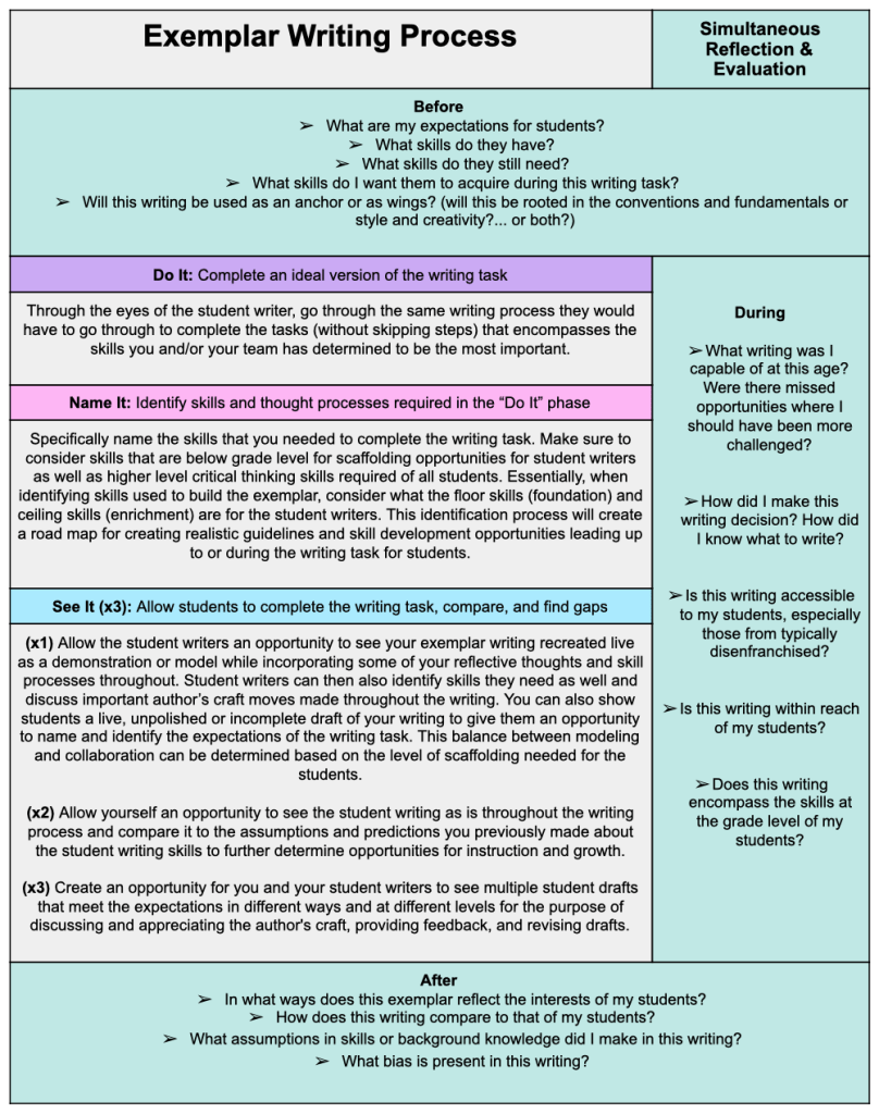 And, it’s not just about the product of the exemplar, it’s about the process that takes place while writing the exemplar that has the power to allow us to engage in important conversations about our expectations for student writers.