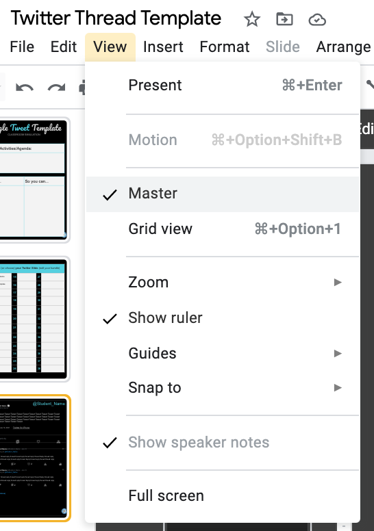 Each Google Slides template has been editing under ‘Master View’, which means that each slide can be duplicated and added while maintaining that essential items for the Twitter template affixed to the background. These elements can also still be edited as needed to fit the needs of the Twitter task at hand. For these particular Google Slides, the ‘Blank’ slide had been edited with the Twitter content. The Google Slides were created with the intention of whole-class or small group collaboration where student writers can think of ideas quickly, respond to the ideas of others, or to team edit pre-created tweets.