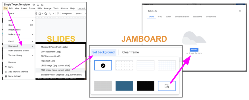 Each Jamboard template was created by downloading a PNG version of the corresponding Google Slides template and then uploading that PNG as the background to the Jambaord, which means if you’d like to make changes to the affixed elements in the background of the template, changes should first be made in Google Slides and then the background can be re-downloaded and uplaoded to the Jambaord. Each Jamboard can be collaborative by duplicating the Twitter template for each student or the entire Jam can be force copied for students to use individually.