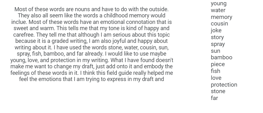 Thomas says, “This helped me realize that there is a lot more that is happening in my scene then just the basketball game.” Looking at his field guide work and then looking back at his draft, Thomas realized he hadn’t described the setting, which is important to his scene. Isolating certain terms ultimately helped Thomas reflect on what he had prioritized (the description of the game) and what he had ignored. It led him to go back and make sure that he mentioned the city (Minneapolis) and spend a paragraph laying out the setting: a stadium packed with energized fans.