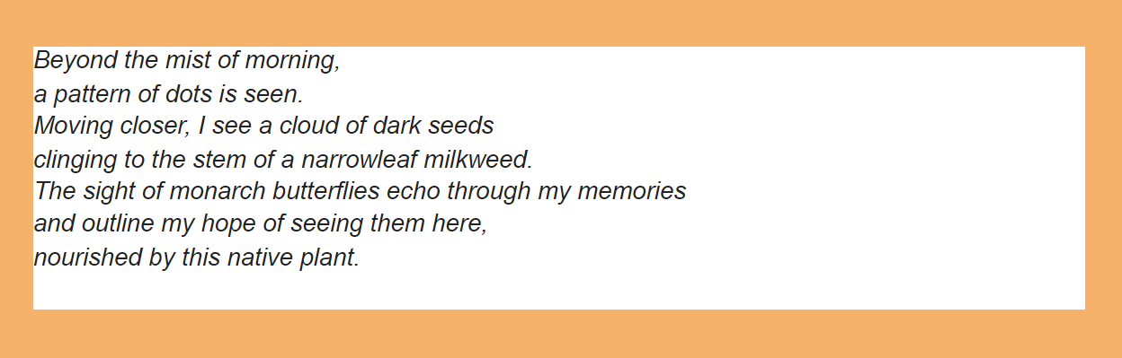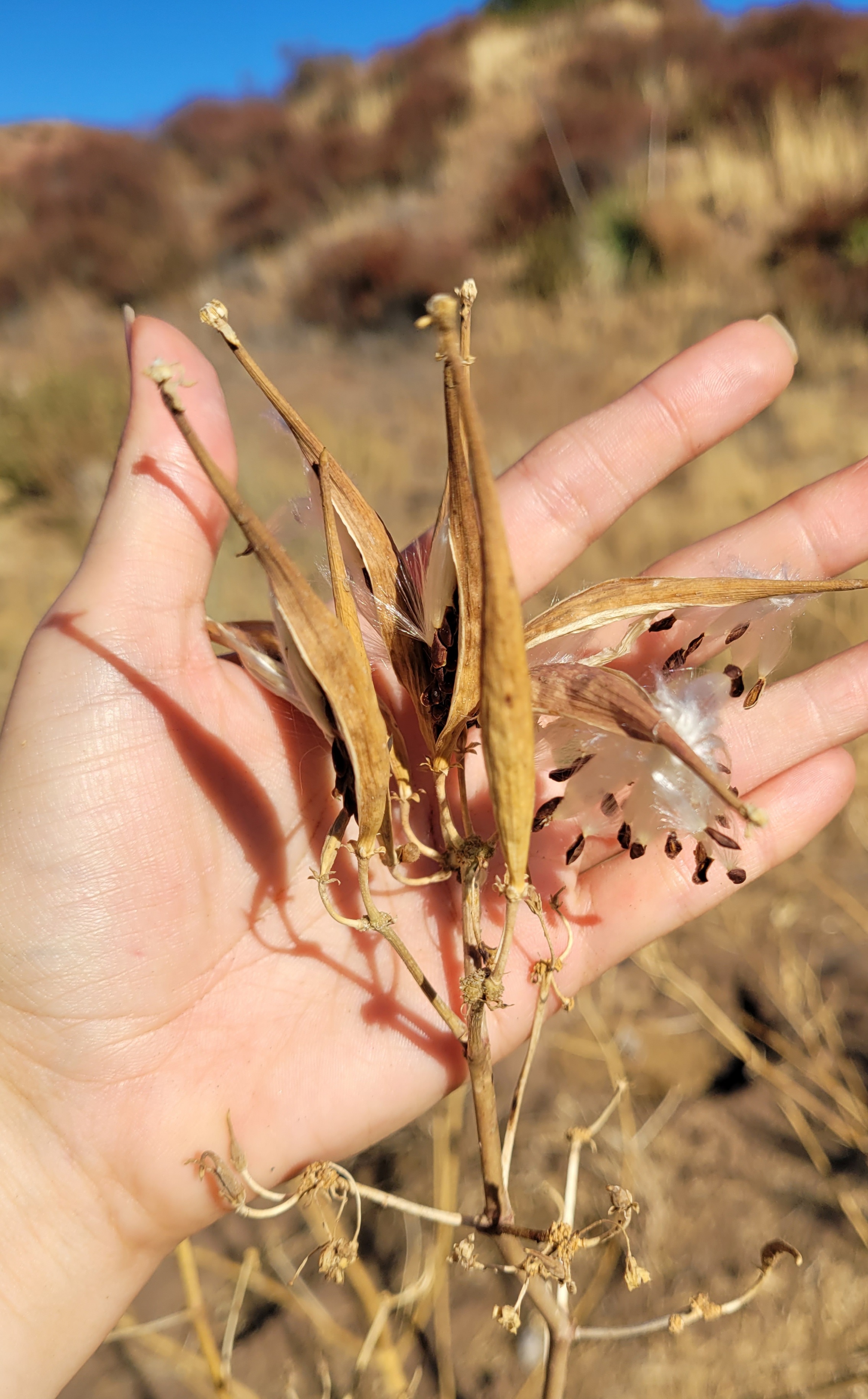 I love offering “writing starts” to students as a provocation to get the pen going. I let them know I often cobble my own writing starts together to connect ideas into a brighter constellation. When I introduce myself to a new group of students, I will tell them about my “small corner” – a habitat restoration area in the Angeles National Forest. At one of the planting sites, I’ve been observing the growth of Asclepias fascicularis (narrowleaf milkweed).