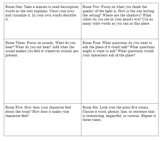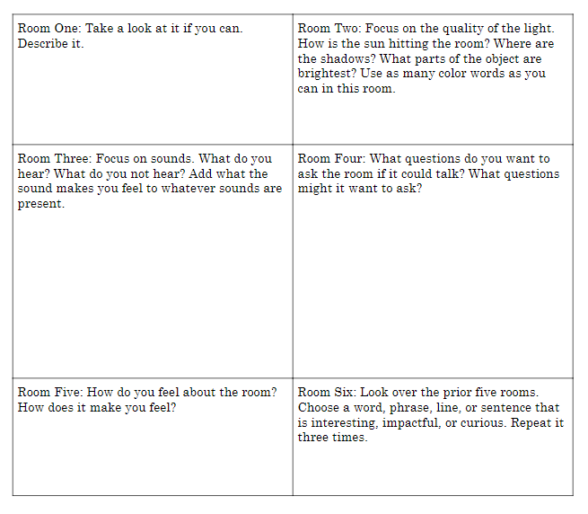 Students read over what they wrote in the six rooms, and then see if you can create a poem. You can rearrange the rooms in any order; eliminate rooms, words, or sentences. I ask my students to at least have 6 stanzas… one for each room. But of course they can definitely have more and we make a short list of what a poem could look and sound like.