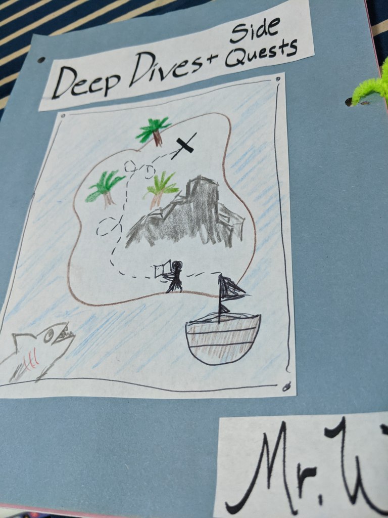 Day 1: After our first Morning Meeting of the new school year, I handed out notebooks to kids. The directions were to make sure it said “Deep Dives and Side Quests” or “DDSQ” on the cover, and to decorate and design it (ie–add a pen holder) however they’d like. I also did a demonstration on how to retrieve and replace the art supplies they use (a lesson I’ll be reteaching every school day for the rest of my life, probably). After they finished, they were to number the first 10 pages or more. In a way, creating and customizing their notebooks would be their first side quest.