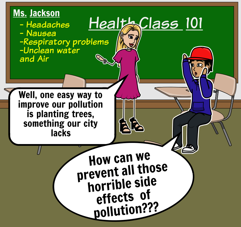 Mayah’s Lot beautifully models how a narrative can stage both a problem and possible solutions. To help students incorporate storytelling when presenting their research findings, I gave them opportunities to create storyboards: that is, visual narratives where instances of environmental injustice and solutions can be presented. Telling a story via images can pare down extraneous verbal information, helping the audience understand the storyteller’s explanation in a visualizable form that can be a memory tool. Storyboard That has a drag-and-drop platform that has been essential in teaching my students how to create sequential narratives about their research. Through using this web-based digital storytelling tool, my students have created stories about topics that otherwise can seem abstract and complex. The ability to illustrate concepts and conflicts at the heart of these topics can demystify the ideas central to them. By using comic storyboards to explain local examples of environmental injustice, they were engaged in acts of rehearsal for conversations outside the classroom. They were also practicing their storytelling before presenting their research to outside audiences in contexts with higher stakes.
