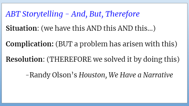 After hearing my students share their initial research findings, it was clear that they knew which environmental burdens harmed communities in Los Angeles, but had merely scratched the surface of telling their audience why. Learning how to sequence their research data into a story of why environmental injustices occurred and how they could be addressed meant practicing a new prewriting strategy: the “And-But-Therefore” storytelling method. ABT gives writers a structure for plotting a story through its key developments: the situation, the complication, and the resolution. In his book, Houston, We Have a Narrative, Randy Olson explains that the ABT storytelling method is recognizable in many popular texts, ranging from the structure of Lincoln’s “Gettysburg Address” to the plot formula of South Park episodes. After our initial reading of Mayah’s Lot, I summarized the story using the ABT structure: