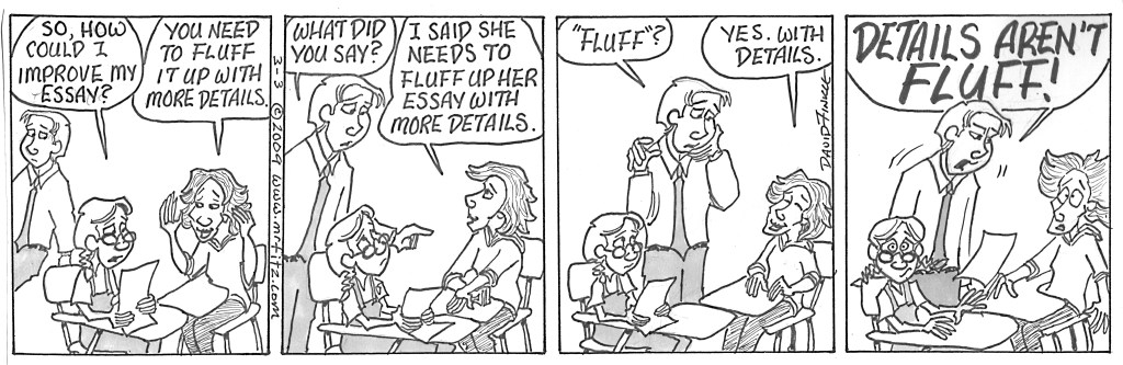 But then we begin to read the essay. Fulghum gives example after example (and some non-examples to boot) of being a “player” and interacting with other players: the bus driver who pretends to agree to drive to the beach with him, the lady at the print shop who claims she is with the Irish Republican Army and is missing a bazooka, the woman who wants him to jump out her birthday cake and go-go dance naked. Every example makes the idea of a Player more and more concrete until when I ask again if they know what a Player is, every hand goes up. That’s how writing works. Our details are not “fluff” – as I have heard students refer to them.