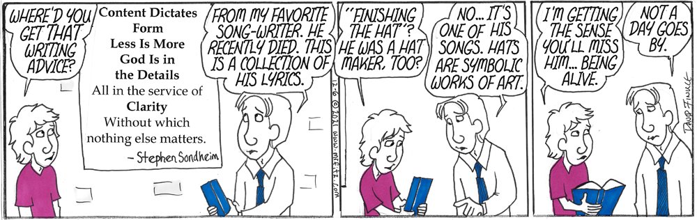 Reviewing Sondheim’s essay on lyric writing and his two volumes of collected lyrics (Finishing the Hat and Look, I Made a Hat) has confirmed for me that Sondheim’s principles hold true for all kinds of writing, but they suggest something about how all of us who teach writing should teach it. We should teach principles of writing, not set-in-stone formulas that can’t be adapted to different circumstances.