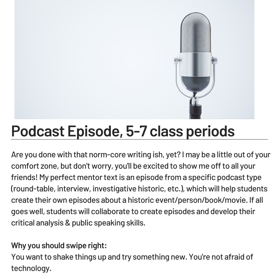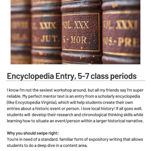 If we were on Tinder, the algorithm would surely funnel the profiles of our synchronous workshops into our feed first, simply based on their accessibility. These workshops are quick and easy, lasting only a class or two. I like to use a synchronous workshop when I want my students to connect the historical content we’re learning to current events. In these workshops, I walk my students through the linear research and cyclical writing processes in one class period, and stick to one mini-lesson around a focused skill that I want to see students develop. Students use the remainder of the class period/homework to create their product.