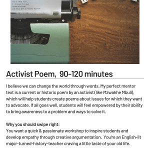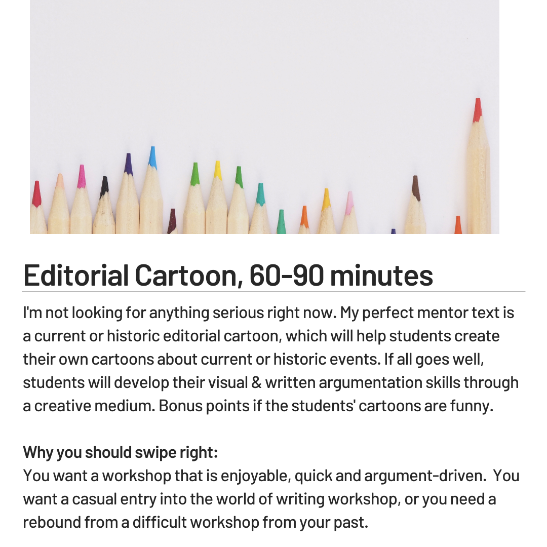 Now that you’ve granted yourself time for curricular introspection, let’s browse through some eligible writing workshop dating profiles. Below, are the profiles of five different writing workshops that I would recommend to anyone, even my own sister. And while I am an only child, I do highly recommend these workshops to any social studies teacher I know.