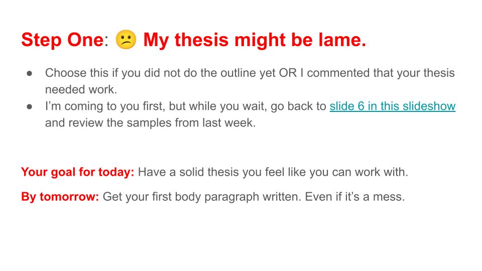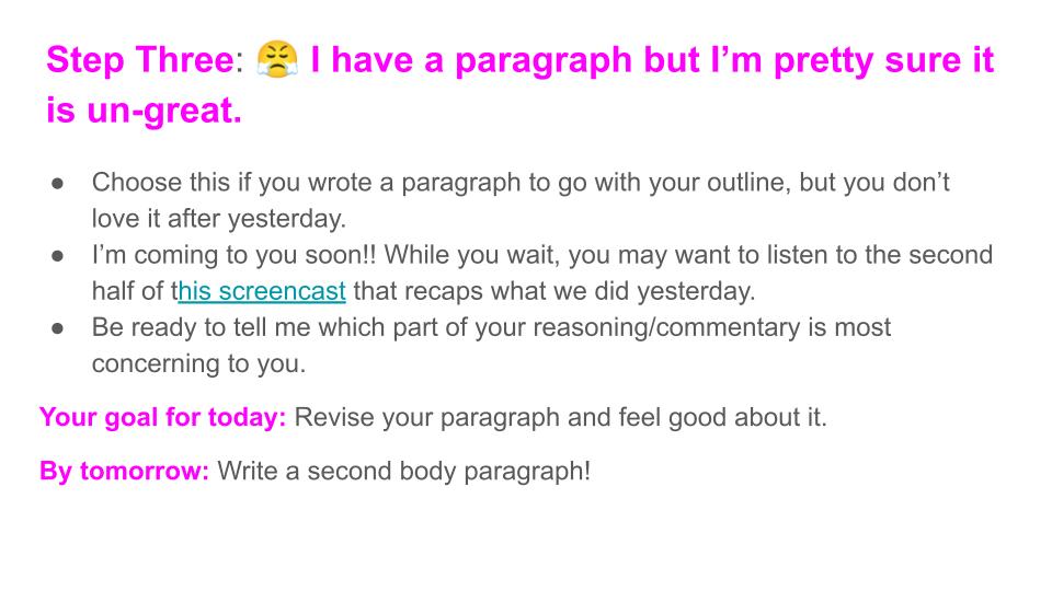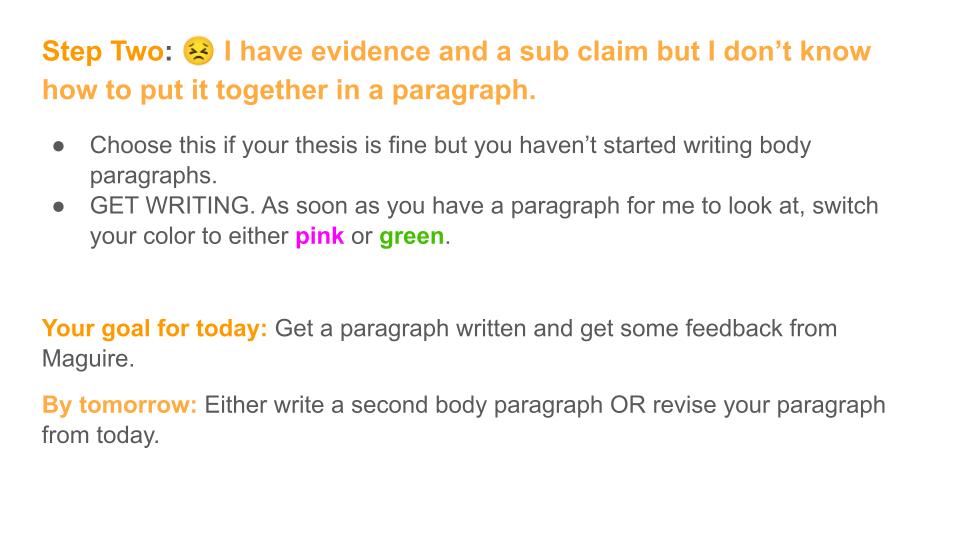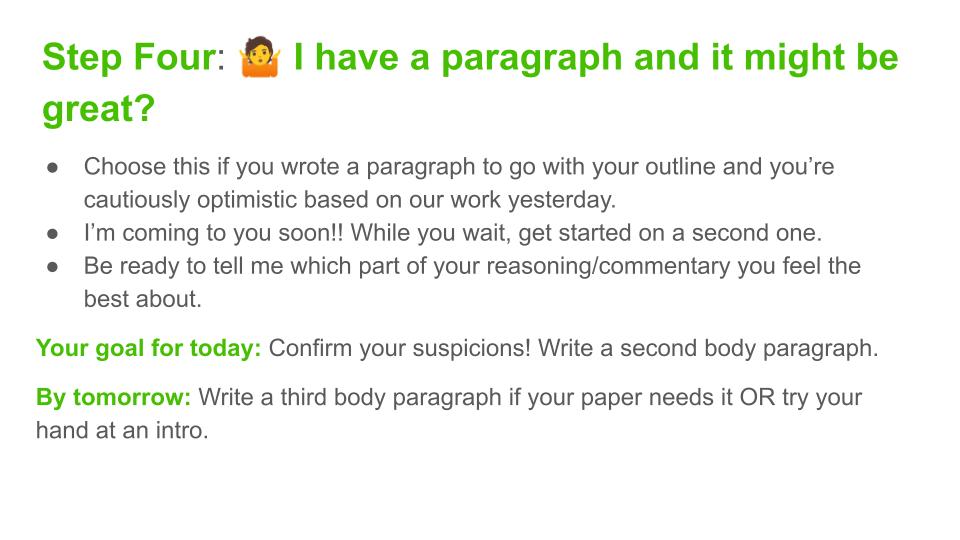 At the end of class today, a student said “So do we have to have our full draft ready for tomorrow?” and I quickly replied “NO!” I’m sure a few will (it is AP, after all), but I quickly revisited the directions slides and told them that I just wanted them to do their next step by tomorrow. Lots of relieved faces and I’m fairly certain almost all will follow through on the small step.