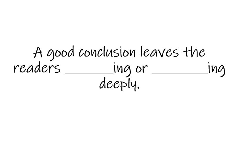 “How would you fill in these blanks?” I ask. And it does not take long until someone gets it right: thinking and feeling. It is the work of a good conclusion to leave readers thinking or feeling deeply, often simultaneously .