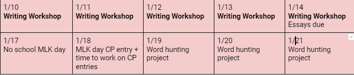 This is an example of backwards/forwards planning that worked particularly well for me. My students turned in essays a week prior to the end of the semester and then spent the next three days working on a project that would lay the groundwork for a language and vocabulary notebook. During those three days of work time, I graded roughly 8 essays a class period (that’s 48!) and was able to squeeze in the others during planning