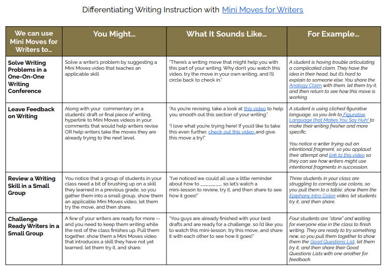 Every writer needs something a little bit different, which is one of the things that makes writing instruction so challenging! But whether the writers in your room need a bit of skill review (one of those things you assumed they “should know how to do by now”) or needs a bit of a challenge (so that they aren’t “done” on the second day of the writing workshop), Mini Moves with Writers can make differentiating easy so that every writer in the room gets what they need.