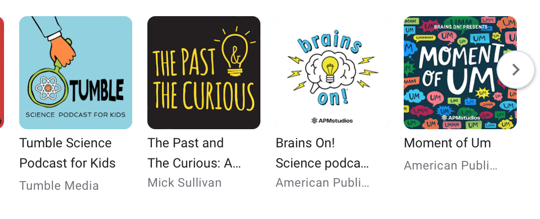 In order to crystalize a vision for success, it can be helpful to see–or hear–what success will sound like. When I first started, I looked for the kinds of podcasts I’d want my students to create. Below, you’ll find some podcasts I found on my mentor text scavenger hunt. When I search for mentor texts, I’m looking for podcasts that are geared toward my student demographic and that cover the kind of content that they’ll be digging into for their projects.