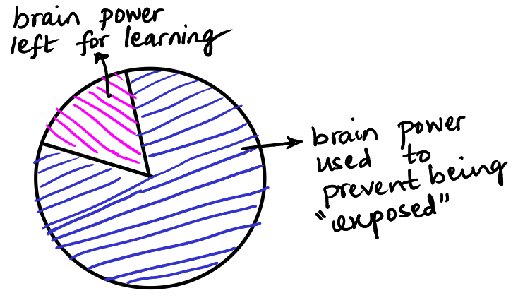 I first draw this (rather unscientific) pie chart of brainpower. I show them that when our mind is exerting enormous effort in preventing embarrassment, very little of its capacity is left for actual learning. Needless to say, the more brainpower we can reserve for actual learning, the more we learn, the faster we learn. I ask the student(s) to draw a pie chart that represents their brain in my class. I also tell them that the chart will look different in different subjects in different classrooms with different teachers in different circumstances.
