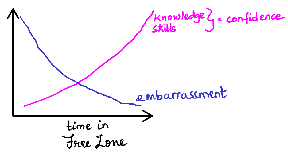 A Free Zone is a zone of time and/or space that is free of embarrassment. This is a zone where you give yourself permission to be fearless and maximize your learning. It is where you do not allow outside influences which may not matter in a few years to dictate how much you learn and how well.