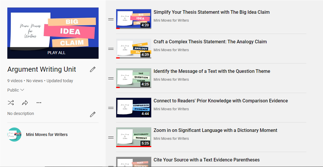 I’ve made you a playlist of 9 mini-lesson videos that can help students with those key skills of argument writing: