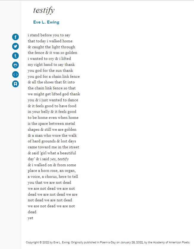 Look at how Eve Ewing’s poem “testify” does something similar, ending on an ominous note with “yet,” but wrapping it in the repeating reminder that “we are not dead.”