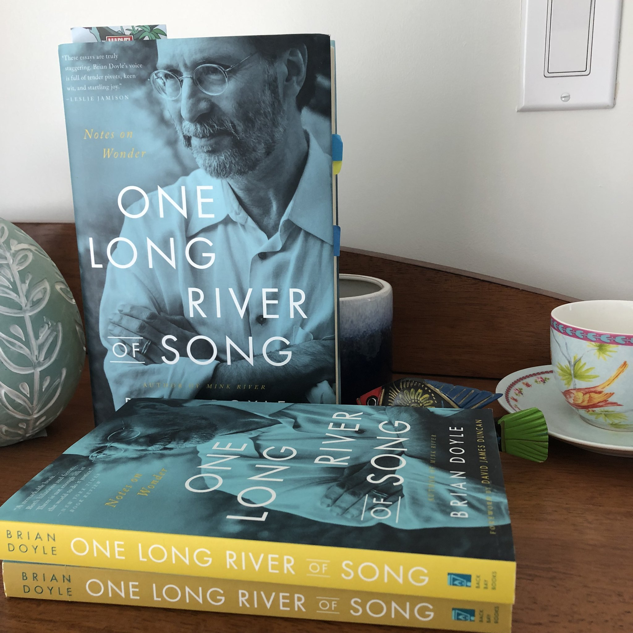 Joel Garza suggested the work of Brian Doyle. The first piece that he sent me, straight into our class the next week. I immediately ordered myself a copy of One Long River of Song: Notes on Wonder, a collection of Doyle’s essays. For a few months now, I’ve been reading an essay a day from this book, a beautiful moment of zen, flagging so many for classroom use.