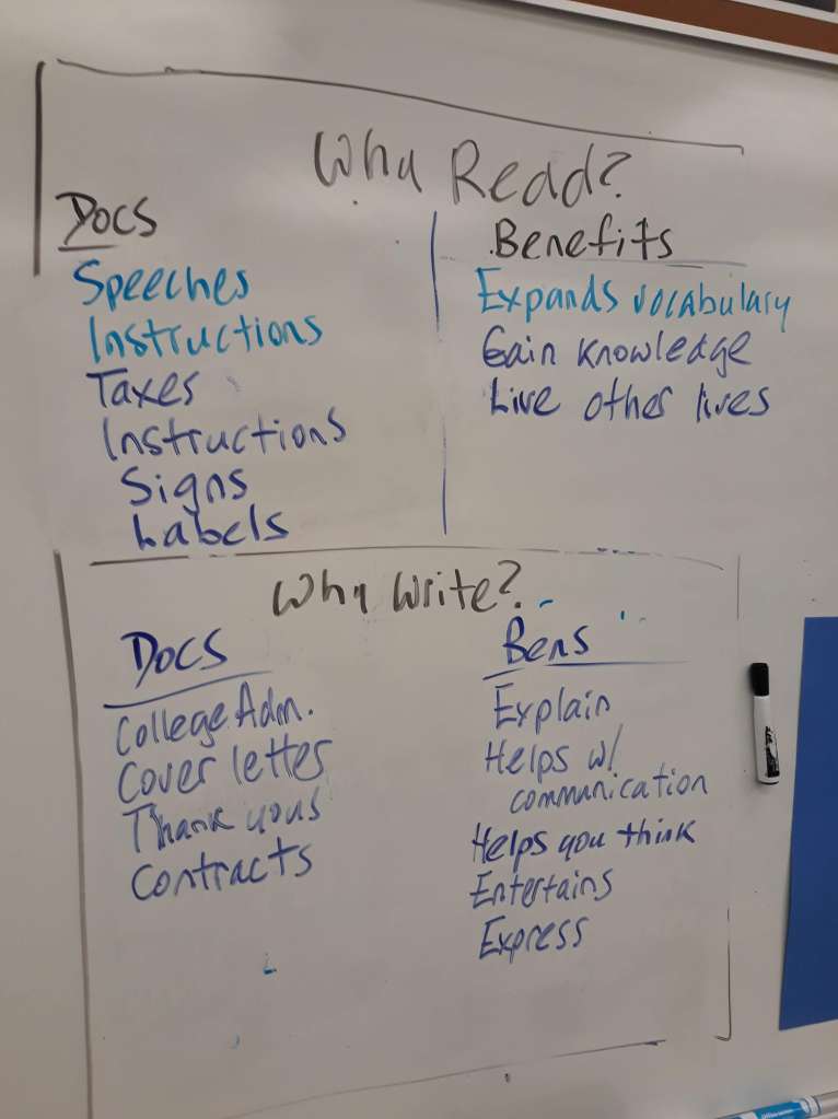 I ask students to come up with reasons to read and write – no school-related reasons are allowed. I let them go at it in small groups. What real-world reasons to read and write can they come up with that have nothing to do with school? I tell them to focus on specific types of documents anyone might need to read and write and specific benefits of reading and writing. I’ll focus here on the writing half of the chart we usually draw on my board or on a big piece of craft paper to hang on my wall.
