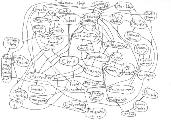 The first is an Enthusiasm Map – for the stuff you love. Here are the directions: Write “Enthusiasm Map” at the top of the page. Put your name at the center. All around your name, create a map/web/list of everything you are enthusiastic about: people, places, video games, music, food, events, books, movies, TV shows, hobbies, sports, etc. Use lines to connect the things that are connected somehow. Here is a sample: