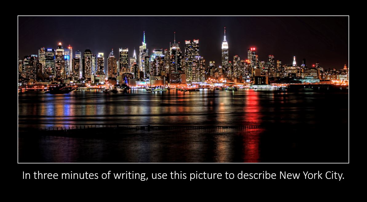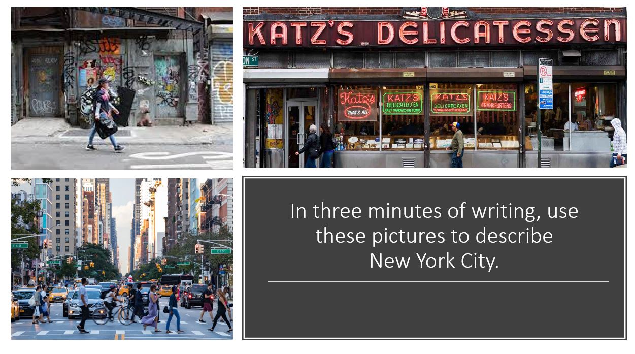 - Describe New York City, using this picture (using the skyline slide). Now describe New York City using these pictures (using the street picture). Which one feels more like you are in the city, a part of the action? Why?