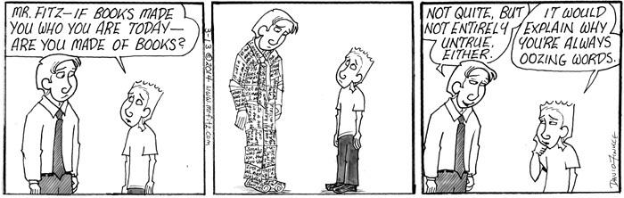 I know that sounds crazy – it sounded crazy to me when I first realized it. Many of us who teach English do so because words have brought so much meaning into our lives, and we want to share that love of words with students. Like my alter ego Mr. Fitz in the strip below, I sometimes feel I am made of words.