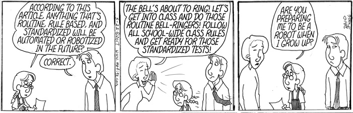Thomas Newkirk’s book Minds Made for Stories drives home the point that we are story-telling beings, and that all our writing, whether we realize it or not, is based on story. Daniel Pink, in his book A Whole New Mind, makes the case that creative people, people who can tell stories, will soon be in demand in a world where many jobs are being automated by algorithms and robots. The kind of writing-to-sources we ask students to do for tests is, quite frankly, the kind of writing that has already been automated. Teaching them to pass tests means teaching them to write like a robot so robots can score them.