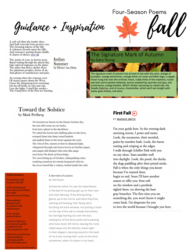 I’m excited to move through this year with this “slow” poetry mini-unit. I’m already looking for winter mentor texts. (And, at the end of the year, I’ll share the complete unit with the Moving Writers Community!) I’m excited about the concept of a slow unit that proceeds apace throughout the school year rather than all at once — where else can I try this? Where else could it benefit our learning rather than make it feel disconnected? Maybe another way I’m growing as a writing teacher this year is by embracing questions and uncertainty as I experiment in my teaching.