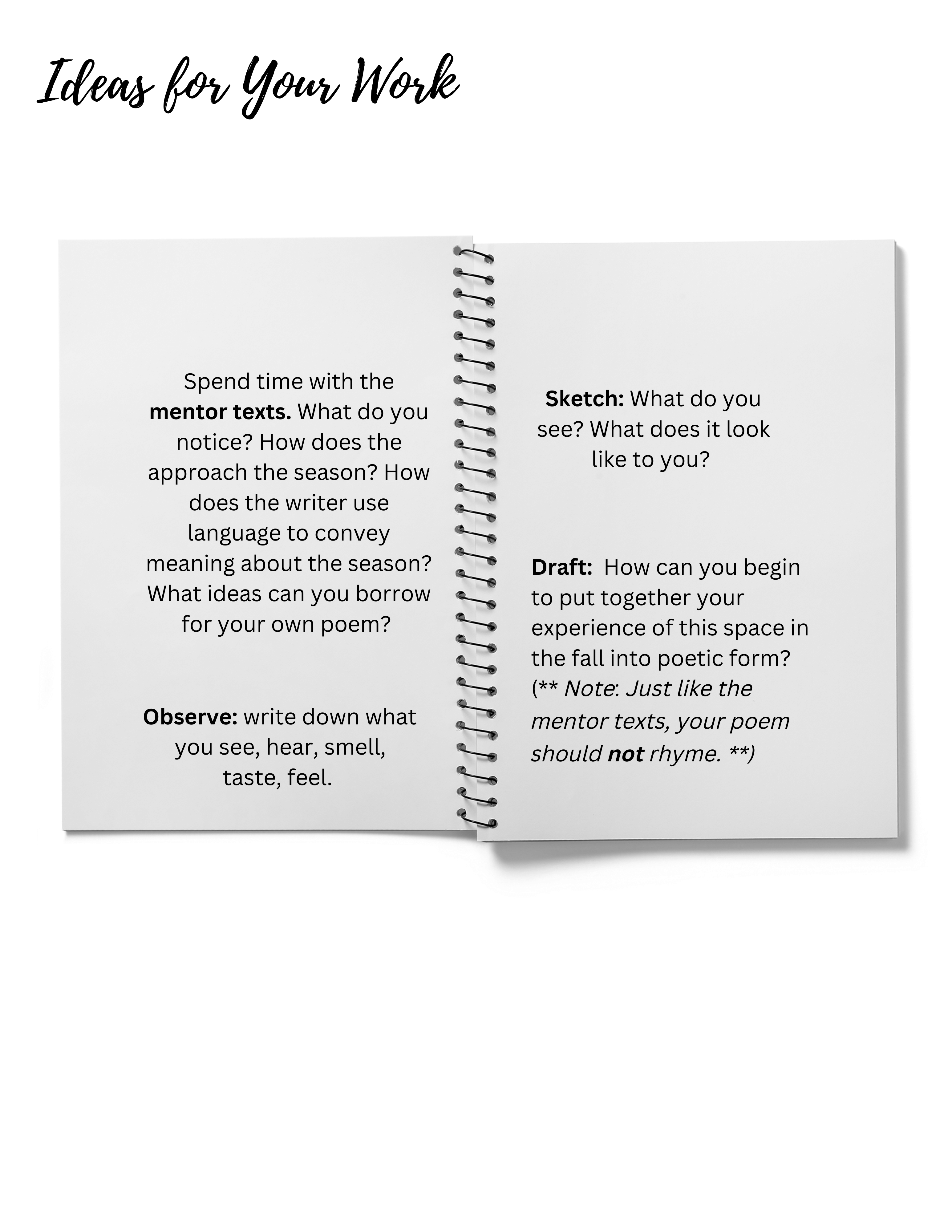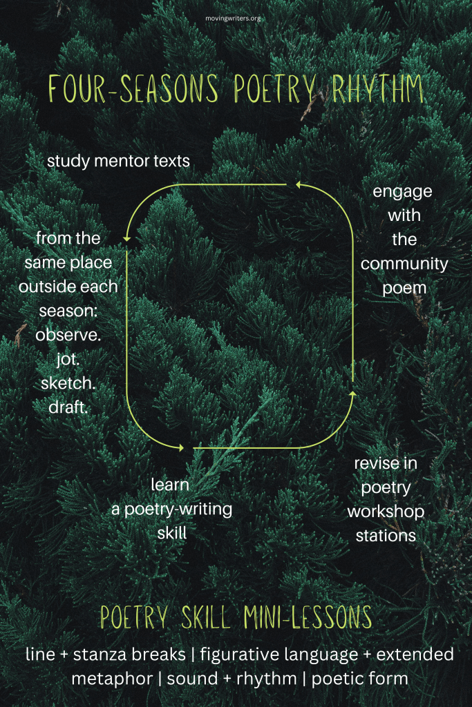 This slow mini-unit takes about 3 days per season (so, 12 days total by the end of the year). We choose a spot on campus and return to that spot one day each season to observe, sketch, jot, and, ultimately draft a poem. We read some mentor texts about places written in that particular season. Then, we do a quick one-day poetry workshop: one foundational mini-lesson and then station work to make our poem drafts a little bit better. Here’s our rhythm each season: