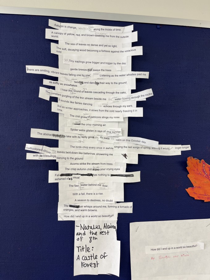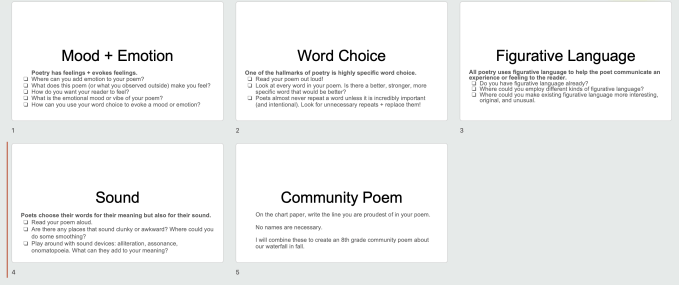 Initially, I was going to basically leave it at that. I planned on asking students to put their poem draft in Google Docs and just walking away until the winter. But students loved our day of writing. And they really did it! So, I felt like it would be a waste to leave this so soon. I added a mini-lesson (this season, line and stanza breaks) and added some poetry revision stations: