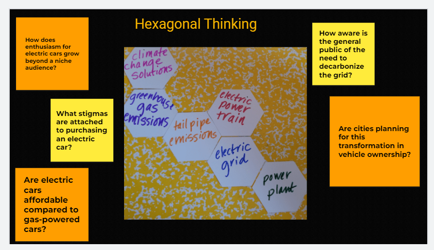 At this juncture, I asked my students to look over their annotated transcripts and meet in groups to discuss. One way to help them weigh a solution is to use the hexagonal thinking strategy. Students record terms, concepts, or ideas on hexagonal tiles and arrange them as they perceive relationships between the tiles, creating a visible web of connections. Based on their podcast noticings, one group arranged tiles so that the terms “climate change solutions, greenhouse gas emissions, tailpipe emissions, electric powertrain, electric grid, and power plant” were placed together, as seen below: