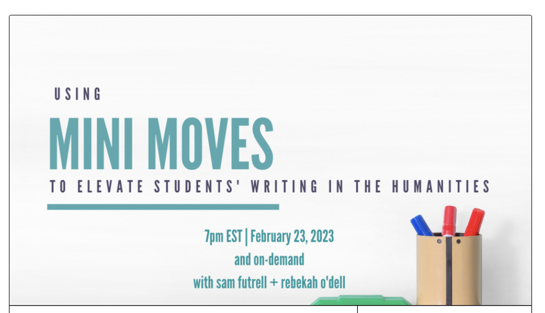 Sam and Rebekah will introduce you to the world of mini-moves — what they look like, where to find them — and how they can instantly elevate the writing your students are already doing. With examples from English and history students, you’ll see how this instructional strategy can easily move all writers forward.