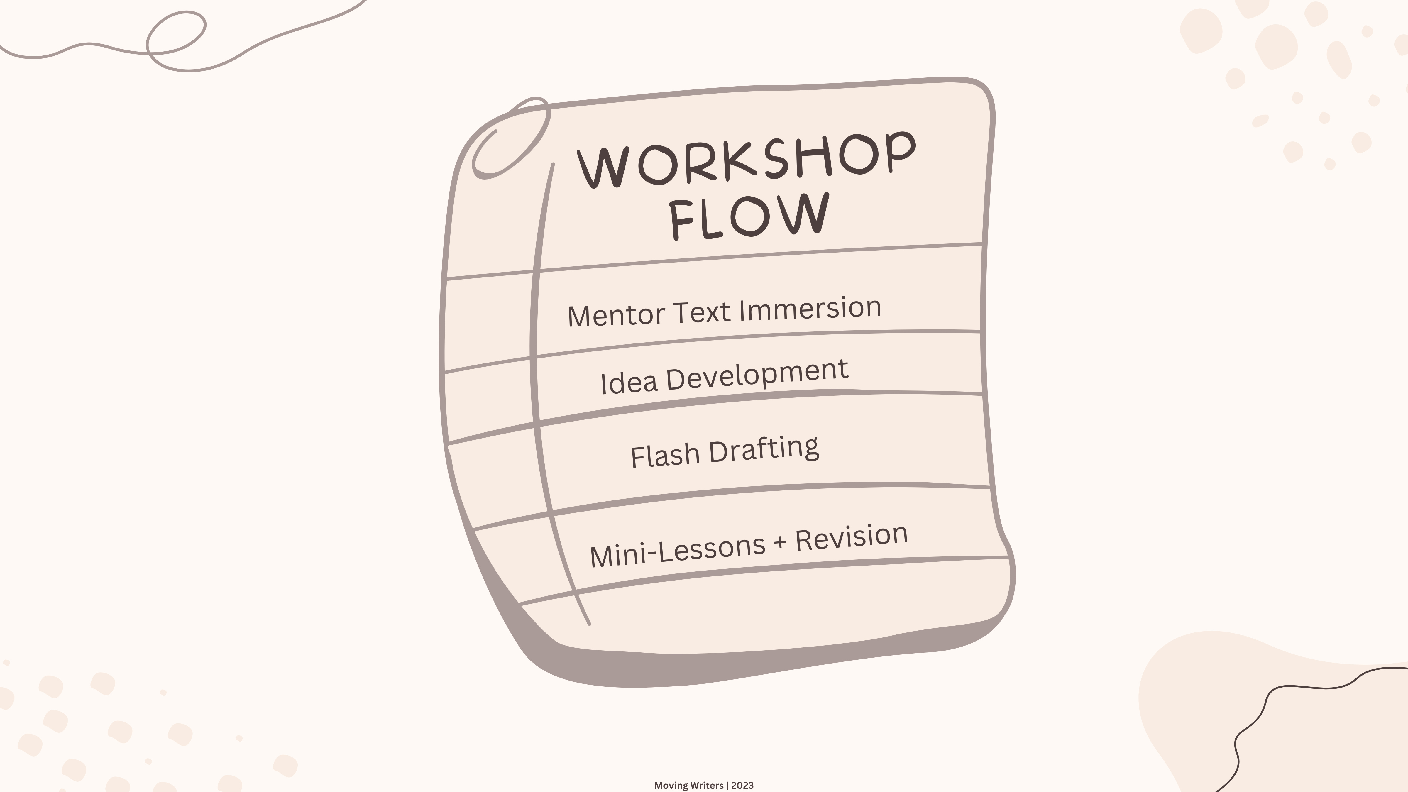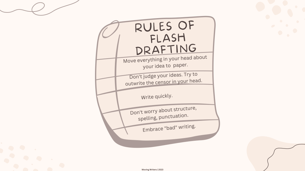 A flash draft is a super-fast, down-and-dirty draft that moves ideas from your brain to paper. It is Anne Lamott’s “shitty first draft” in school-appropriate language. Here’s how a typical writing workshop flows in my classroom: