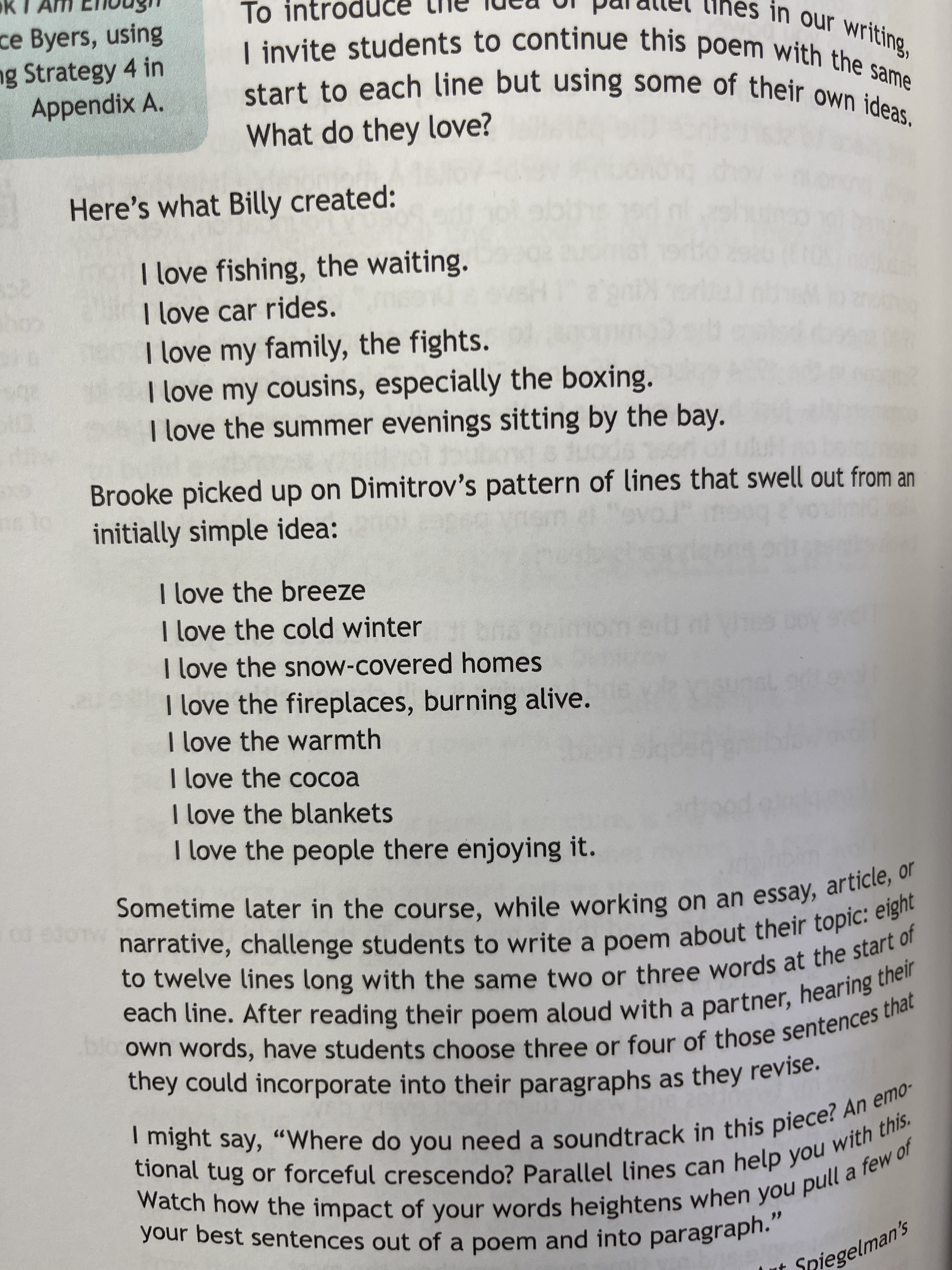 While this book will get your students writing poetry in their notebooks, it is not a book ABOUT writing poetry. Rather, it shows how the rough-and-tumble process of crafting words into something beautiful can help writers learn almost every writing skill we need them to learn and meet the standards we need them to meet.