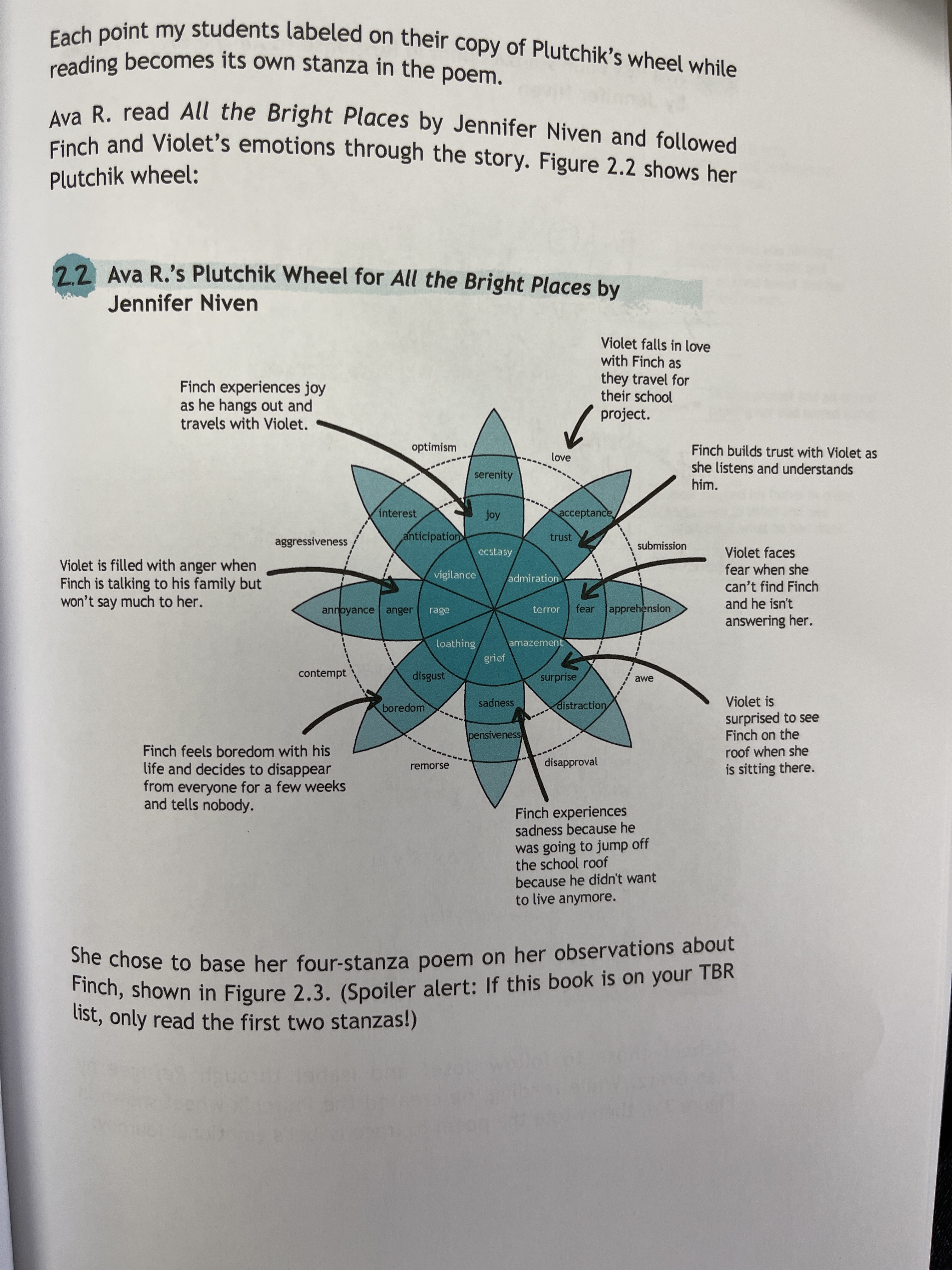 There is even a chapter that shows how students can use Plutchik’s wheel of human emotions to track development through an independent reading novel and eventually lead to literary analysis of the theme of the book, an idea I first explored in this 2020 post on Moving Writers.