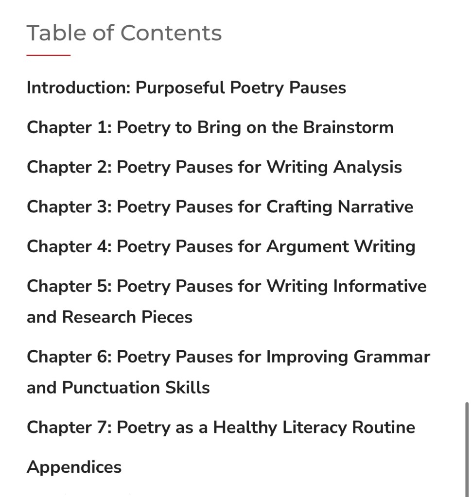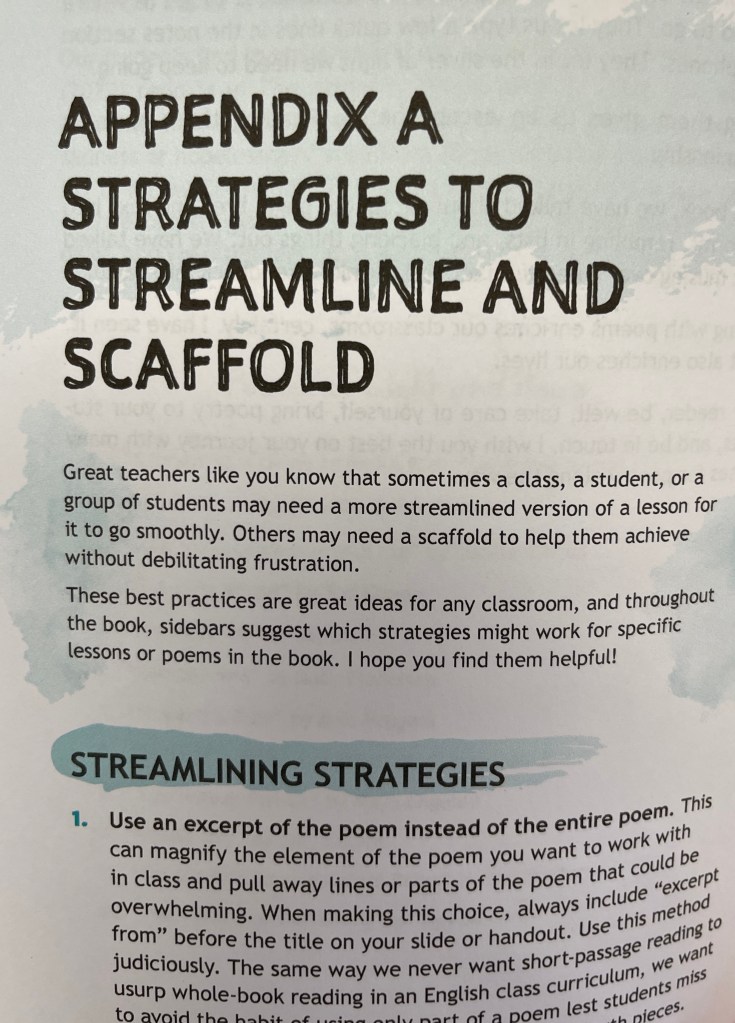 There is an appendix full of strategies to streamline and scaffold lessons so that we can meet the needs of all of our students as we pause for poetry, and this is a list you will find helpful for any lessons in the ELA classroom. New teachers will love this list!