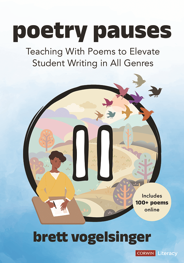 My book, Poetry Pauses: Teaching with Poems to Elevate Student Writing in All Genres is now available from Corwin Press or on Amazon. Tell me in the comments if how you are already using ideas from this book, or how you plan to in the coming school year! You can connect with me on Twitter @theVogelman or at my website www.brettvogelsinger.com