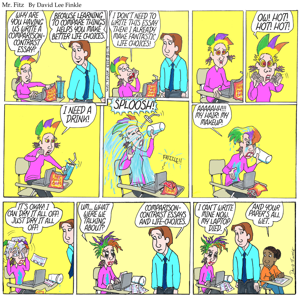 For comic effect, of course, I have the students in my comic strip not quite see the benefit of writing to help them make decisions, but in real life, I have seen students benefit from this type of writing. I have, too. Whenever I have some decision to make, I nearly always go to my journal and, as I suggested above, weigh the pros and cons. There are very simple ways to get students to weigh (pardon the pun) their options in writing.