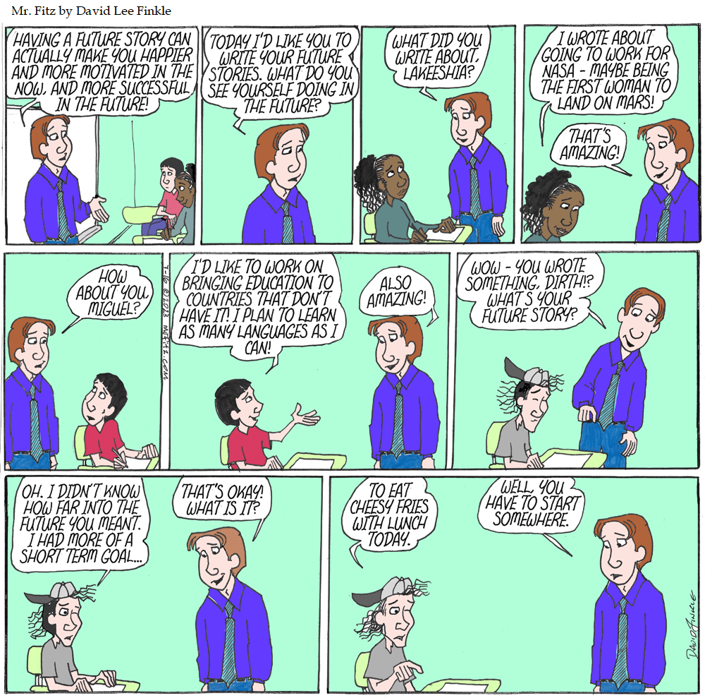 I have read that students who have a “future story” – a hopeful idea of what their future will be – tend to have better futures, even if those futures don’t match up with the exact details of their future story. And thinking about the future has benefits even in the short term…
