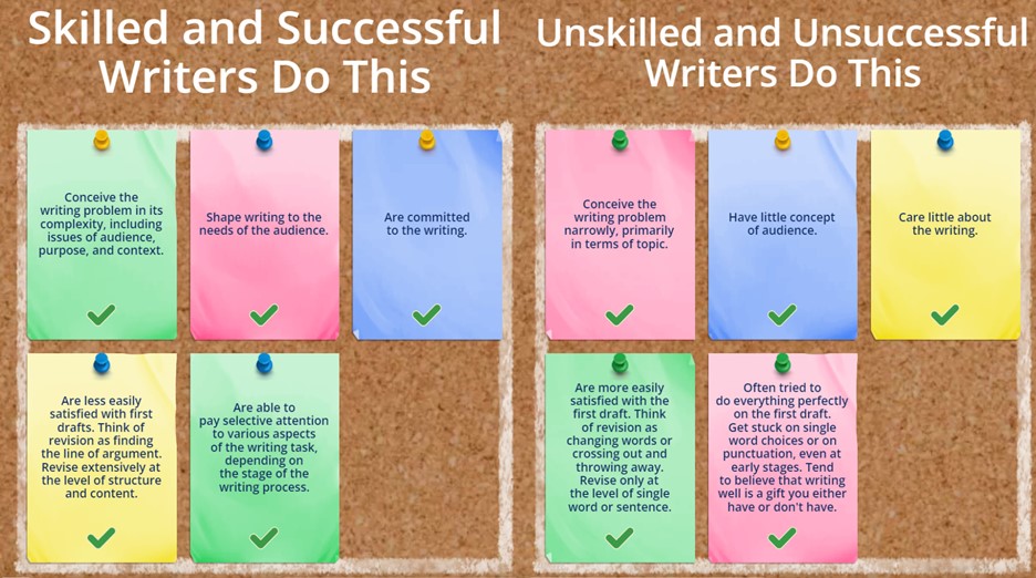 First, we discuss the habits of good writers. How can we have them if we don’t know what they are? I give students the following characteristics, excerpted from Carnegie Mellon’s Eberly Center, and ask them to sort these behaviors either using slips of paper or on our touch screens using Wordwall.