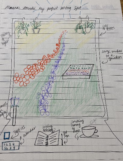 The next lesson we launch into is about our habits of space, focus, and motivation. I ask students to think about how, when, and where they are most comfortable writing and what sorts of support they need to begin. We discuss and think about areas of our room that are most conducive to focused writing and then we sketch our writer’s space, labeling our props and describing what such items do for our writing process.