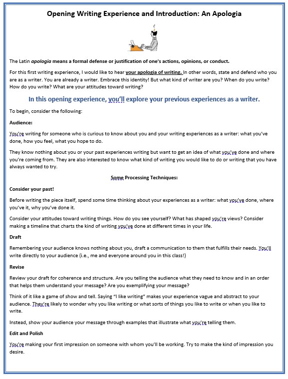 For this first writing experience, I would like to hear your apologia of writing. In other words, state and defend who you are as a writer. You are already a writer. Embrace this identity! But what kind of writer are you? When do you write? How do you write? What are your attitudes toward writing? How did you come to have these attitudes, habits, or approaches?
