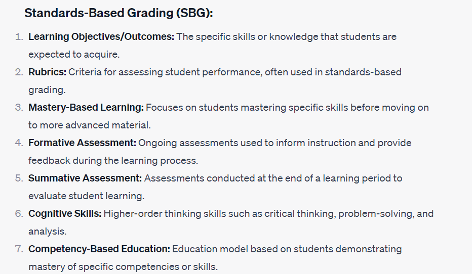 Here’s one way that’s pretty brand new and cool: You ask an AI to give you some words to help you look. For my model I am researching the merits of Standards Based Grading compared to a traditional 4 point scale approach. Here’s what ChatGPT generated when I asked it for a useful set of search terms to find good research in these fields (one of the nicest things about AI search generators is their ability to reply thoughtfully to pretty casually worded questions).