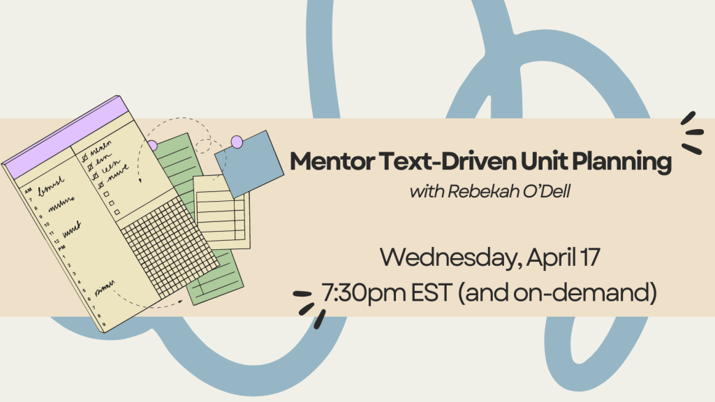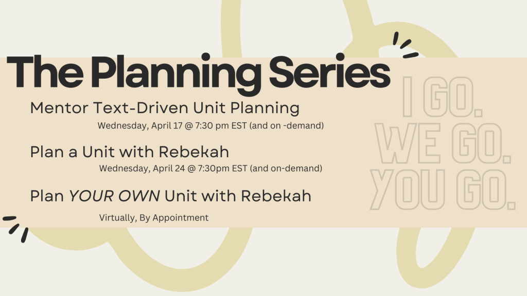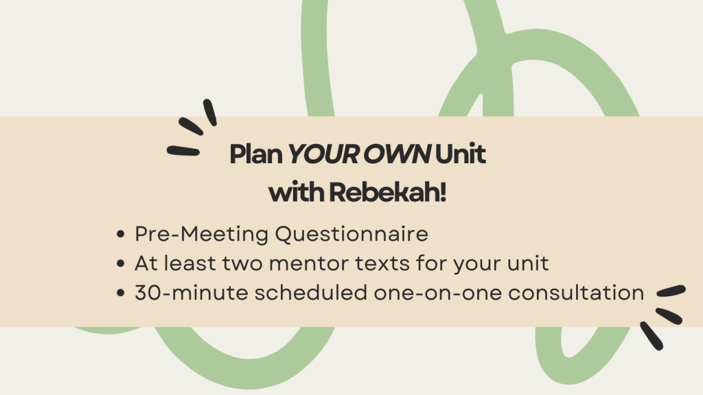 Session 3: Plan YOUR OWN Unit with Rebekah — this is where it gets REALLY good. Participants will complete a questionnaire about a mentor text-driven writing unit they wish to plan. Then, Rebekah will get to work pulling mentor texts. We’ll meet one-on-one for 30 minutes to talk through the mentor texts and begin laying out your writing unit!