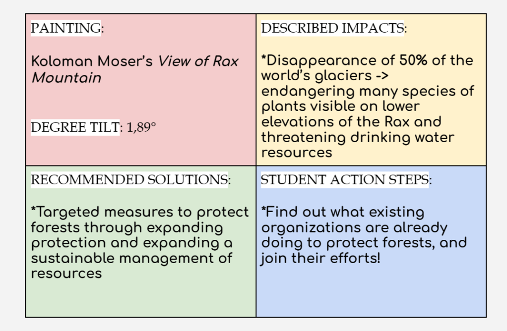 Step 1: Give your students time to browse the A Few Degrees More exhibit at the Leopold Museum in Vienna and to spend time gazing at the fifteen paintings displayed. Through a collaboration with the Climate Change Centre Austria and renowned scientists from various fields, the museum exhibitors were able to determine the precise number of degrees by which climate change would impact the landscapes depicted in the painting and how it would affect the natural environments captured by the artists. Observing the tilted artwork literalizes the concept of “tipping point” in a way that provokes thoughtful scrutiny. A tipping point is the critical point in a situation, process, or system beyond which a significant and often unstoppable effect or change takes place. How does looking at the tilted paintings make an abstract concept more concrete?