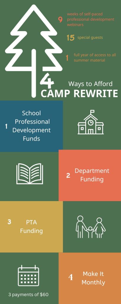 4 Ways to Afford Camp Rewrite! May 21, 2024Rebekah O'Dell Subscribe now using the link below or email Rebekah (movingwriters@gmail.com) to arrange for purchase order payment or get a site license that grants your entire organization access to Camp Rewrite! Head over to Camp Rewrite and Subscribe for the Summer! Share this: Click to share on X (Opens in new window) X Click to share on Facebook (Opens in new window) Facebook Click to email a link to a friend (Opens in new window) Email Click to share on Pinterest (Opens in new window) Pinterest Like Loading... Related