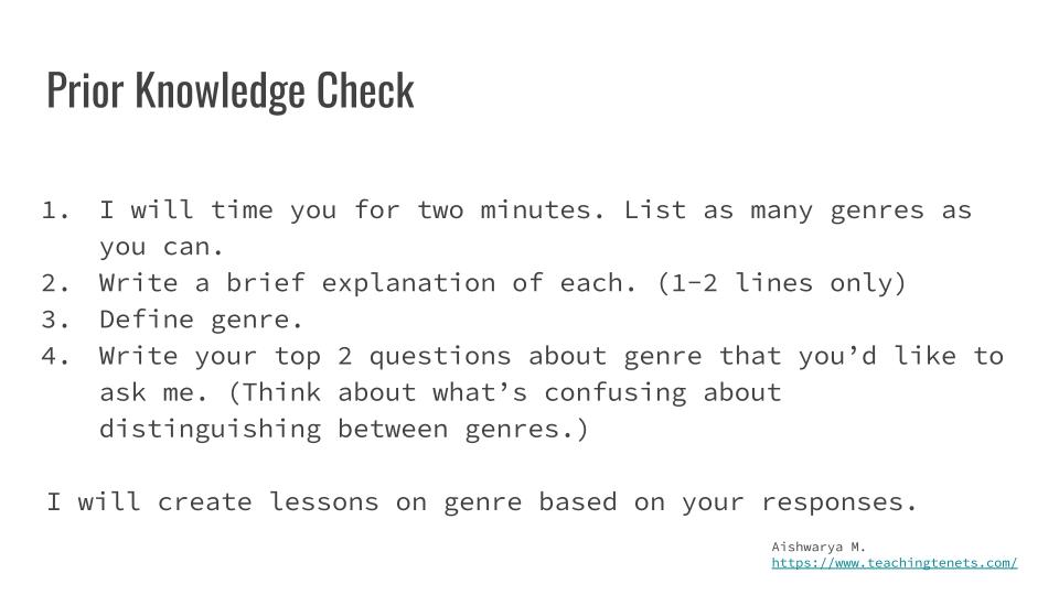 - the difference between ‘genre’ and ‘theme’ (I have taught ‘themes’ earlier, and my students are good at identifying themes.)